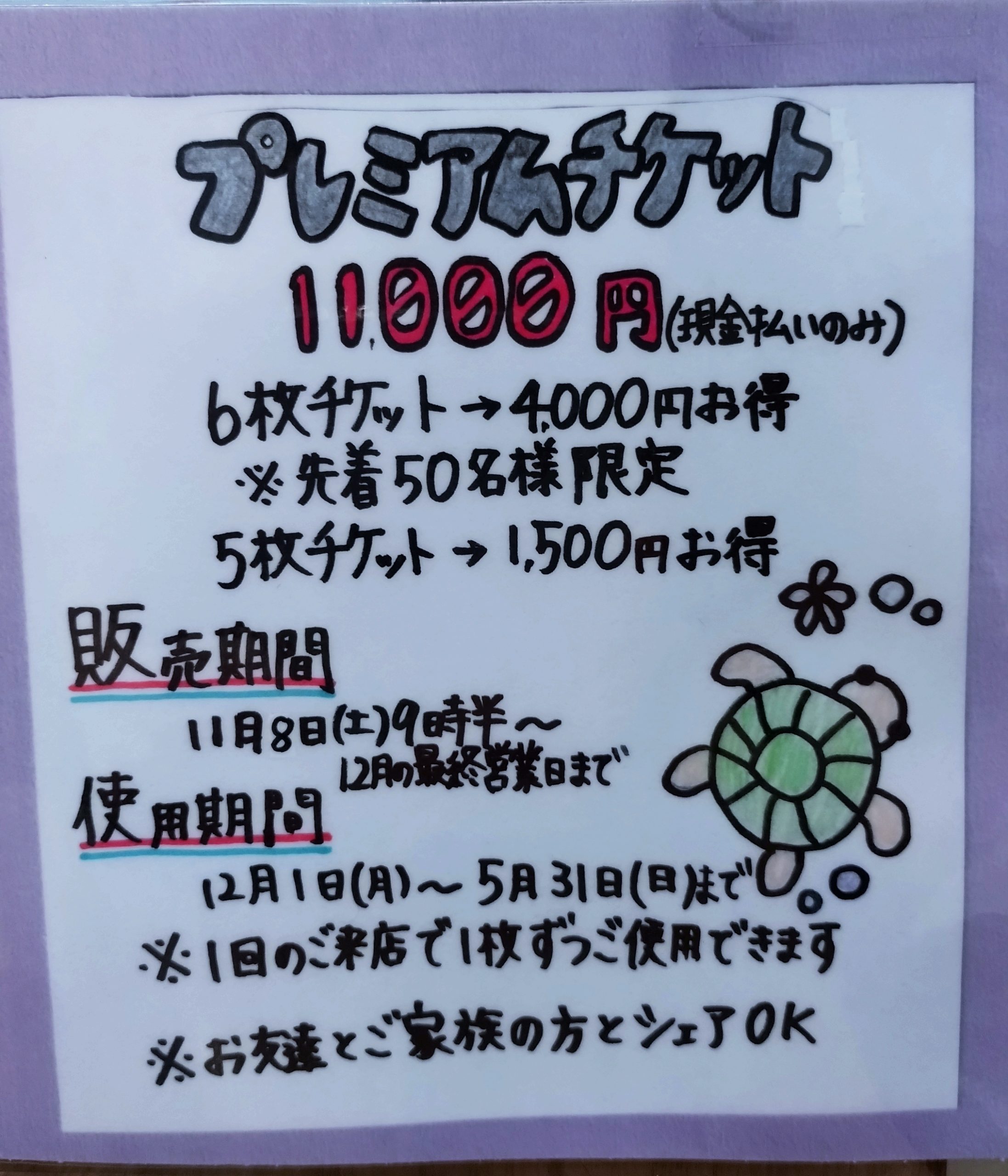 プレミアムチケットのお知らせ 2025.09.04Mai Tweet Share +1 Hatena Pocket RSS feedly Pin it みなさん こんにちは! まだ少し先の話になりますが… 今回はプレミアムチケットの販売のお知らせです! 販売期間、使用期間などお間違いないようにお願いいたします。 なお、販売開始日は普段の営業開始時間より30分前になりますので、お気をつけください。 Tweet Share +1 Hatena Pocket RSS feedly Pin it 投稿者: PureMaiコメント: 0 今日のスタイル 見ーーつけた