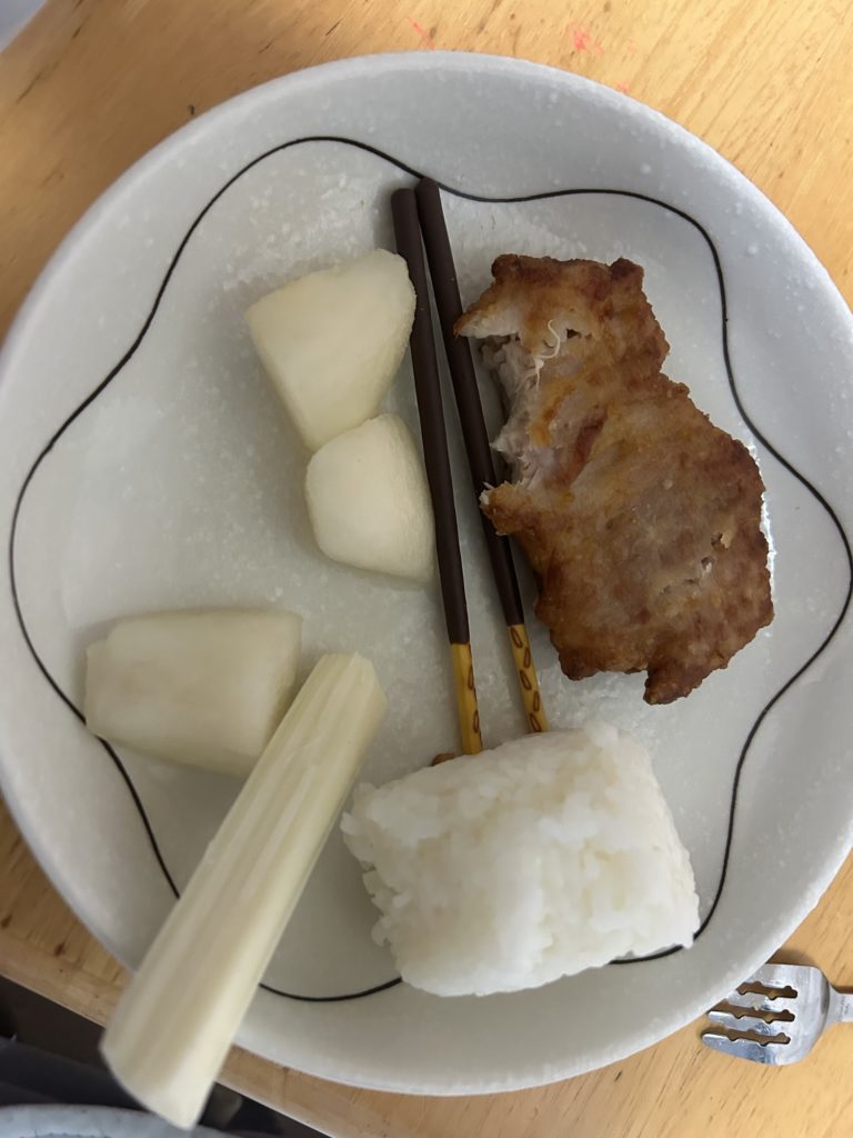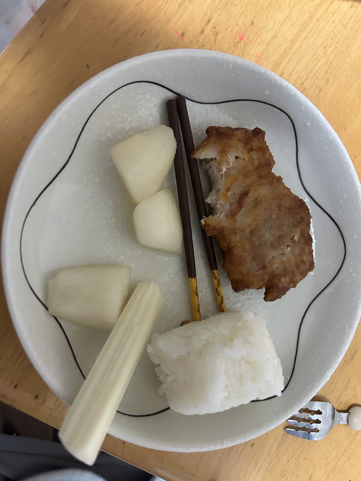 セブンの揚げ鶏、ポッキー、梨、さけるチーズ、塩むすび。