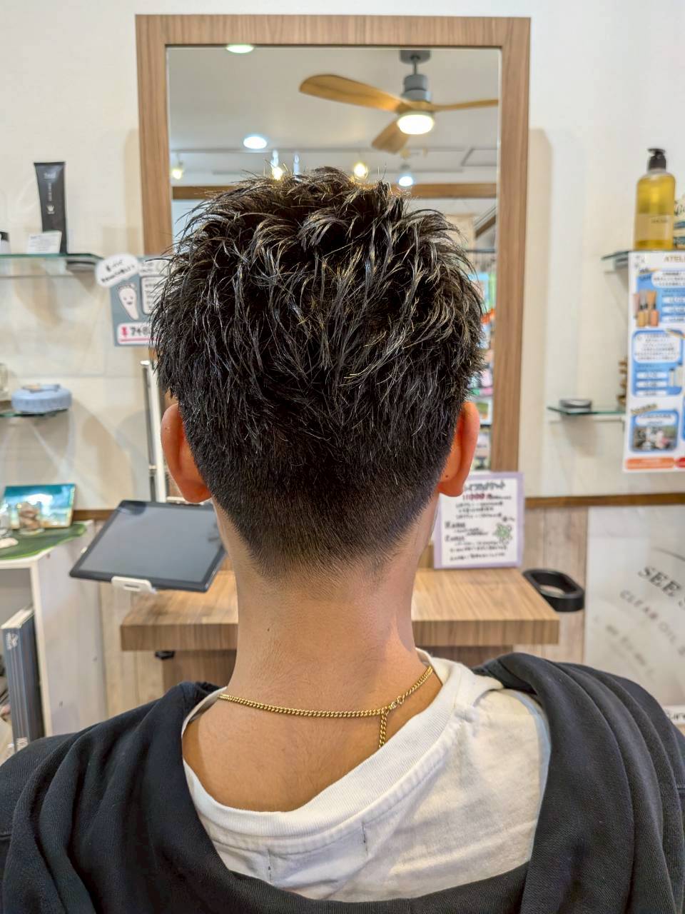 襟足をスッキリと刈り上げたスタイルに、トップは動きを出しやすいように程よい長さを残しています。