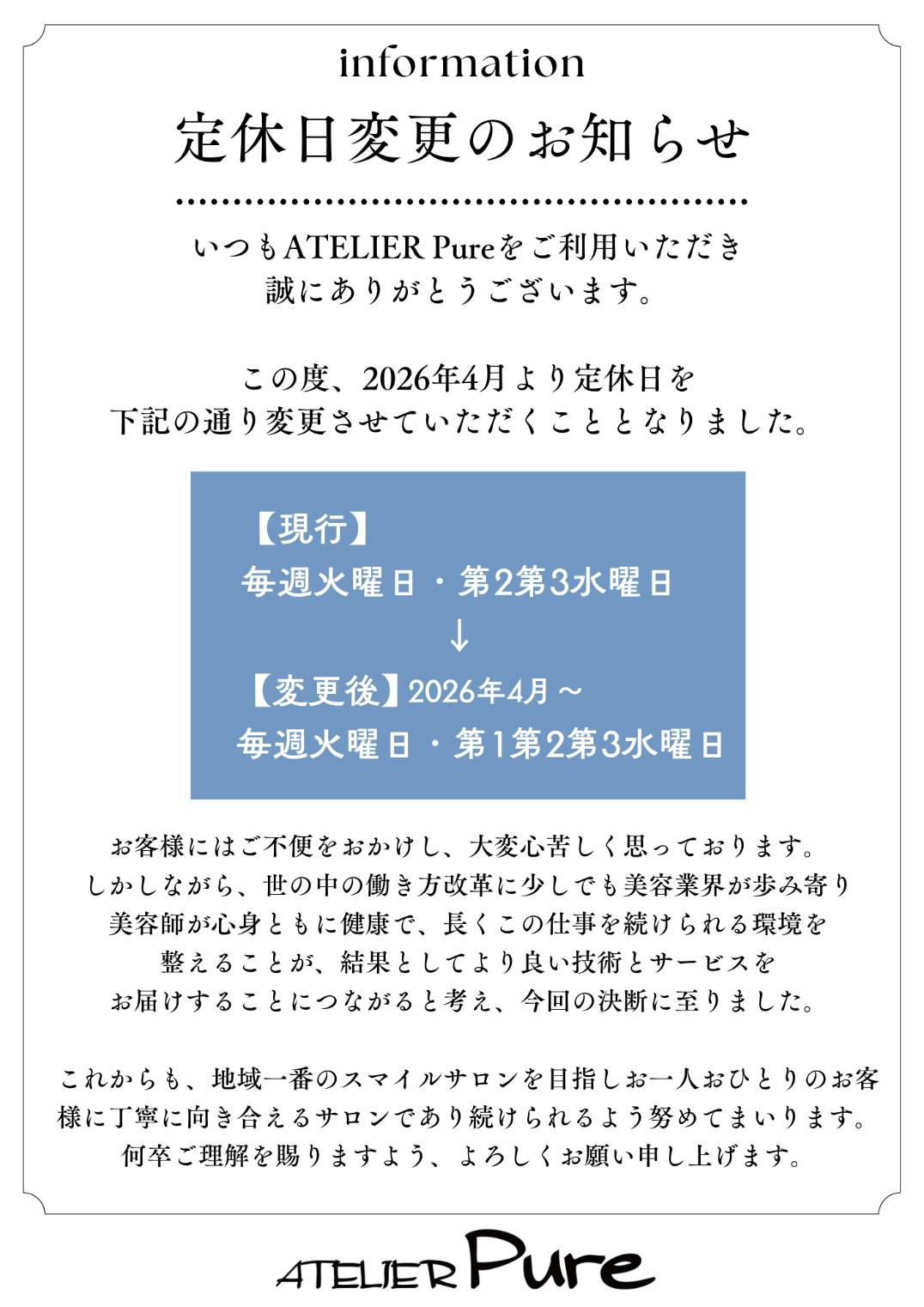 2026年4月より定休日の変更を